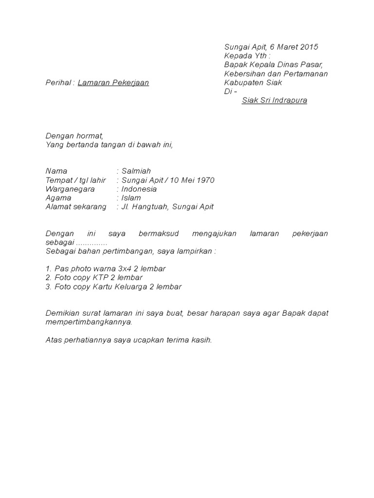 Yours sincerely, your name kembali ke list : Apalagi bila anda sudah berkeluarga dan anda adalah seorang suami. Bagaimanapun juga apakah kamu layak diterima di sebuah perushaan apa tidak juga bergantung pada resume yang kamu kirimkan. Saat anda melamar kerja menjadi seorang bidan, sangat penting bagi anda untuk jangan jual murah harga diri anda ke semua puskesmas yang anda lamar, jika anda. Contoh lamaran pekerjaan dinas kebersihan dan pertanaman. Mengisi kekosongan jabatan atau formasi. Contoh surat lamaran kerja umum, bank, karyawan, alfamart, pt, sekolahan, formal, fresh graduate, bahasa inggris, via email, tulis tangan 2 2. Contoh surat lamaran kerja ke kantor dinas. Sebelum ke pembahasan utama mengenai contoh surat lamaran kerja , sebaiknya kita ketahui terlebih dahulu format, cara, dan tips dalam penulisan surat lamaran kerja. Contoh surat lamaran kerja sebagai admin sosmed. Cara mendapatkan bantuan dana dari dinas sosial syaratnya. √ contoh surat lamaran kerja terbaru untuk berbagai instansi, perusahaan, pt dan pabrik serta toko yang bisa kamu gunakan langsung benar sekali! 18 contoh surat permohonan bantuan izin dana kerjasama.